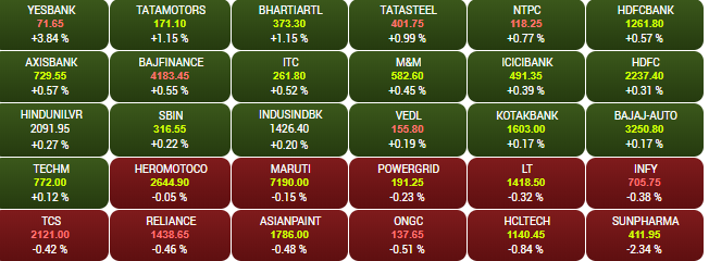 After trading lower for most of the day, the headline indices recovered in the late afternoon trade on Monday to end in the green. The Sensex closed 21 points higher at 40,345 while the Nifty ended above the 11,900-mark. Yes Bank, ICICI Bank, Tata Motors were among the biggest gainers in the Sensex, jumping up to 6 per cent. Heromotocorp, VEDL, TCS were among the biggest losers, shedding up to 2.5%. A look at LIVE Sensex heatmap.