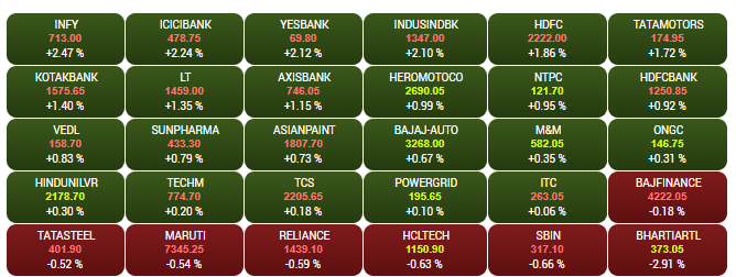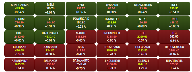 The headline indices opened lower on Wednesday morning, despite the Modi government's infra push. The Sensex was down about 100 points to 40,153, while the Nifty was trading near the 11,900-mark. HCL, Tech, Bharti Airtel shares were among the top losers, shedding up to 1.5%. FM Nirmala Sitharaman said that the Narendra Modi-led government is eager to modify rules and boost investment in the infrastructure space. A look at LIVE Sensex heatmap.