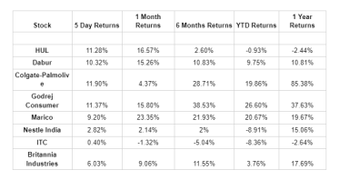 All 15 constituents of the index traded in the green today, reflecting widespread bullish sentiment in the sector. Leading the charge, stocks like Dabur, Colgate-Palmolive (India), Godrej Consumer Products, and Marico posted gains between 8% and 9%. Hindustan Unilever (HUL) shares surged over 9%, marking HUL’s biggest single-day gain since April 2020.