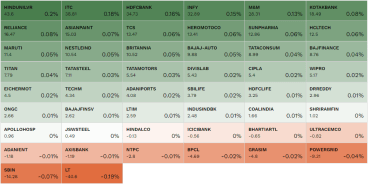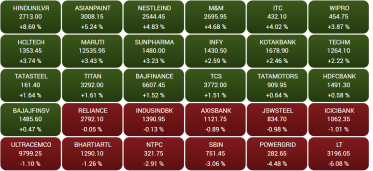 Hindustan Unilever, Hero MotoCorp, Nestle India, Britannia Industries, and Asian Paints are the top gainners on NSE Nifty 50 index whereas the top laggards incude Hindalco Industries, L&T, Adani Enterprises, Power Grid Corp, and Adani Ports and SEZ.