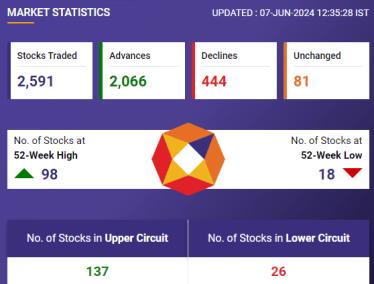 The BSE Sensex hit a new high of 76,795.31 jumping over 1,650 points or 2.5%. While the NSE Nifty 50 is just 18 points away from a fresh high.
