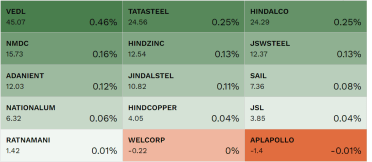 Hindalco Industries, JSW Steel, Adani Ports and SEZ, Grasim, and Kotak Mahindra Bank are the top gainers on NSE Nifty 50 index whereas the top laggards include Hero MotoCorp, Mahindra & Mahindra, Sun Pharma, NTPC, Power Grid Corp.
