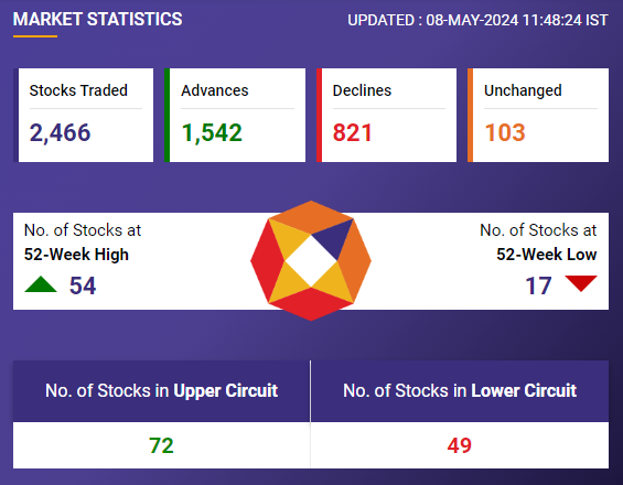 Share Market News Today | Sensex, Nifty, Share Prices Highlights: The benchmark equity indices closed sideways on May 08. The NSE Nifty 50 gained 4.45 points or 0.02% to finish the day’s trading at 22,306.95, while the BSE Sensex closed 19.42 points or 0.03% lower at 73,492.43. Nifty Midcap 100 closed in green up 421 points or 0.85% at 50,095.45.