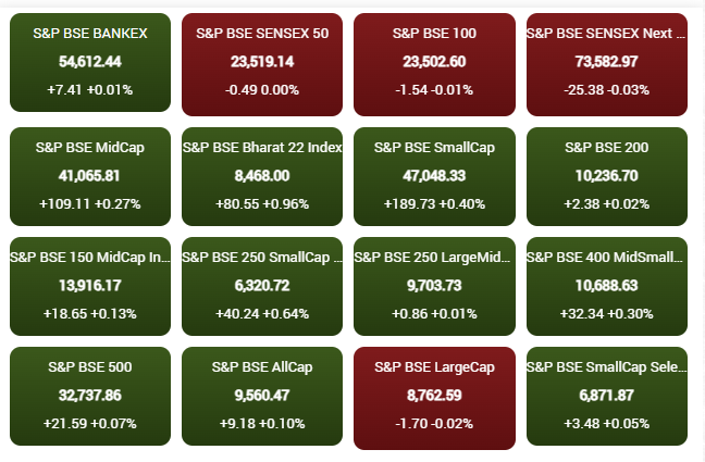 The NSE Nifty 50 traded flat marginally higher by just 1.45 points or 0.01% at 22,403.85, while the BSE Sensex gains just 31.43 points or 0.04% to 73,884.37.