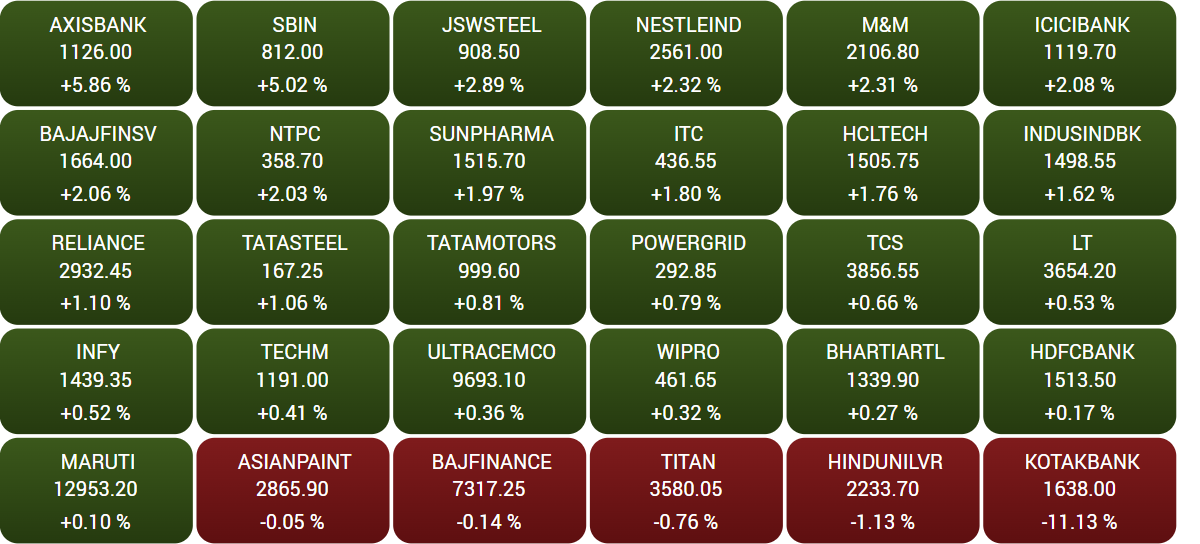 Axis Bank, State Bank of India, Dr Reddy's Lab, Nestle India, and Hero MotoCorp are the top gainers on NSE Nifty 50 index whereas the top laggards include Kotak Mahindra Bank, LTIMindtree, Titan Company, Hindustan Unilever, and Bajaj Finance.