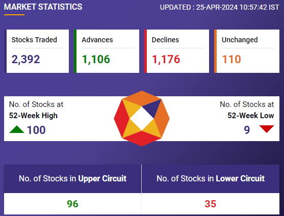 The NSE Nifty 50 opens down by 0.38% at 22,316.90, while the BSE Sensex drops 0.38% to 73,572.35 in the opening trade.