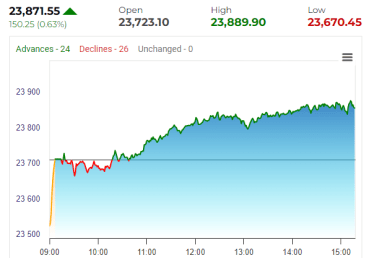 The NSE Nifty 50 gained 147.50 points or 0.62% to settle at 23,868.80, while the BSE Sensex jumped 620.72 points or 0.80% to 78,674.25.
