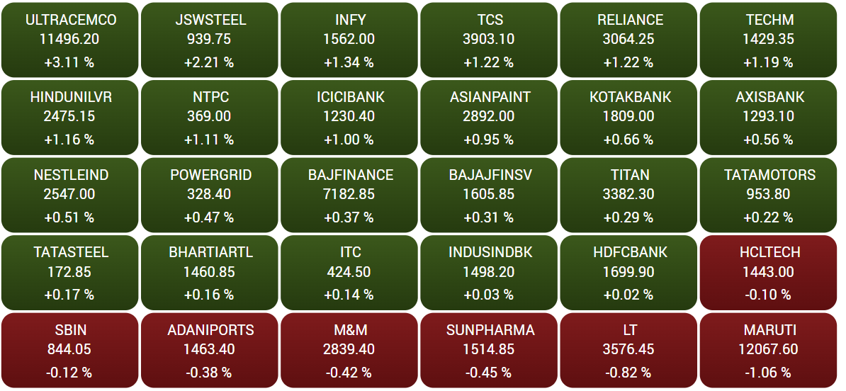 UltraTech Cement, Dr Reddy's Lab, Grasim, JSW Steel, and Tata Steel are the top gainers on NSE Nifty 50 index whereas the top laggards include Bharti Airtel, Mahindra & Mahindra, Tech Mahindra, HCL Tech, and Wipro.
