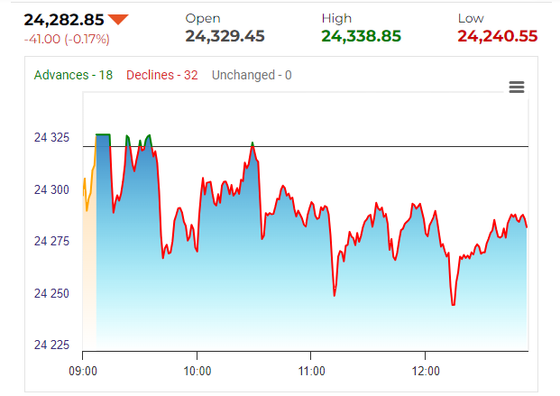 The NSE Nifty 50 was down 41 points or 0.17% at 24,283, while the BSE Sensex was down 115 points or 0.14% at 79,881.42.