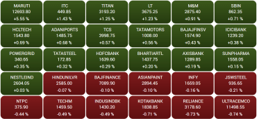 Maruti Suzuki India, Britannia Industries, ITC, Kotak Mahindra & Mahindra, and State Bank Of India are the top gainers on NSE Nifty 50 index whereas the top laggards include Tech Mahindra, Reliance Industries, Bharti Airtel, Infosys, and Grasim.