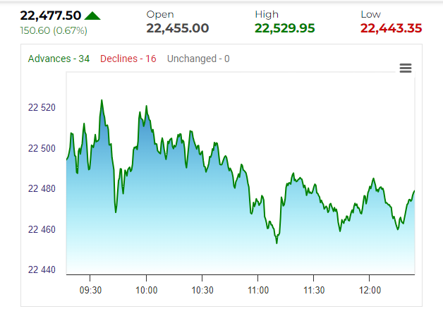 The NSE Nifty 50 opens up by 0.57% at 22,455, while the BSE Sensex jumped 0.43% to 73,968.62 in the opening trade.
