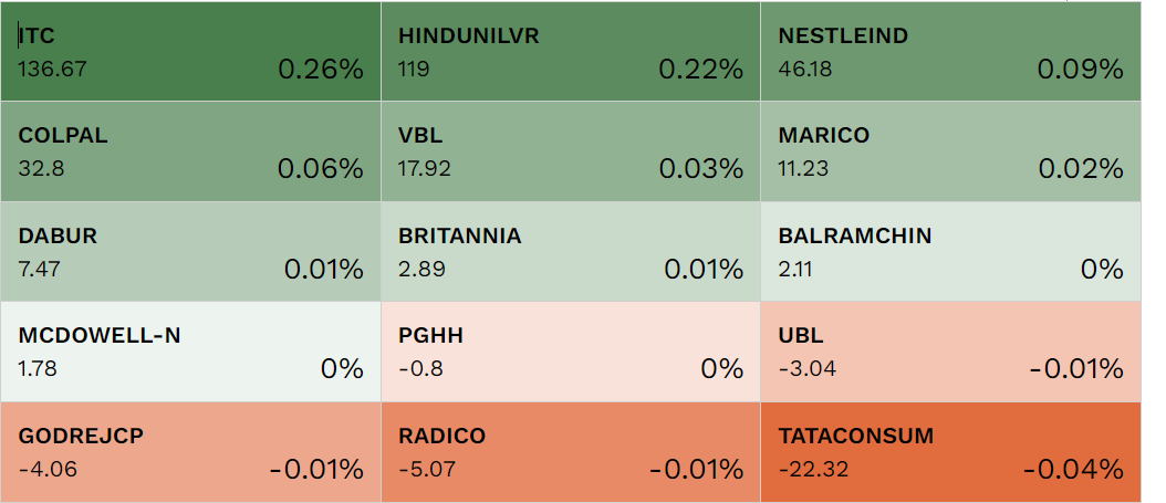Colgate Palmolive, Hindustan Unilever, Nestle India, Balrampur Chini, and ITC were the top gainers in the Nifty FMCG. While Tata Consumer Products, Radico Khaitan, United Breweries, Procter & Gamble, and Godrej Consumer Products were the key laggards in the Nifty FMCG on April 23.