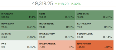 The Bank Nifty Index gains over 1000 points to its new all time high of 49,216.30 lead by ICICI Bank, AU Small Finance, State Bank Of India, Axis Bank, IndusInd Bank, and Kotak Mahindra Bank.