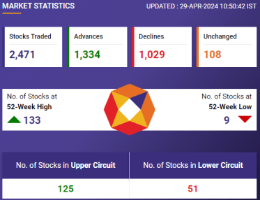 The NSE Nifty 50 opens up by 0.25% at 22,475.55, while the BSE Sensex jumps 0.34% to 73,982.75 in the opening trade.