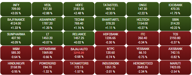 The headline Sensex receded from record highs in the afternoon trade on Monday, led by sell-off in auto stocks. After rising about 318 points to hit a fresh record high of 40,483.21, the Sensex closed 137 points higher at 40,301.96. The broader Nifty ended the session 55 points higher at 11,945. Infosys share price closed 3% higher at Rs 709. A look at LIVE Sensex heatmap.