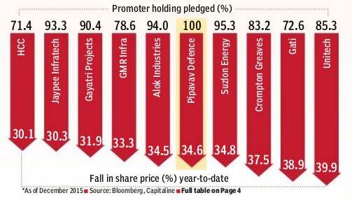 Recently, a Prime Database report said that in the quarter ending December 2015, promoter share pledges increased 14% to Rs 2.03 lakh crore sequentially. Promoters of 517 companies have pledged nearly 46.35% of their shares, the highest since the 2008 global financial crisis.