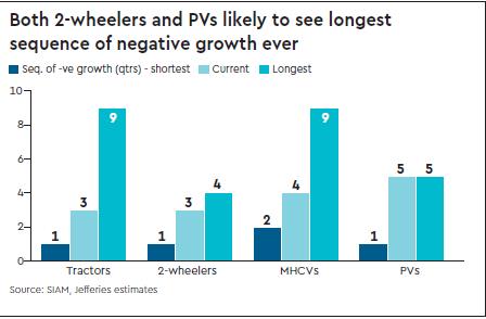 The auto down-cycle is currently in its 3rd (Tractor, LCVs), 4th (MHCVs, 2w) and 5th (PVs) quarter across segments. Historically, downcycles have lasted an average of 7-11 quarters but a wide range of 4-23 quarters means timing the recovery can be tricky. The extent of volume decline has surprised negatively so far, particularly in 2-Ws and PVs.