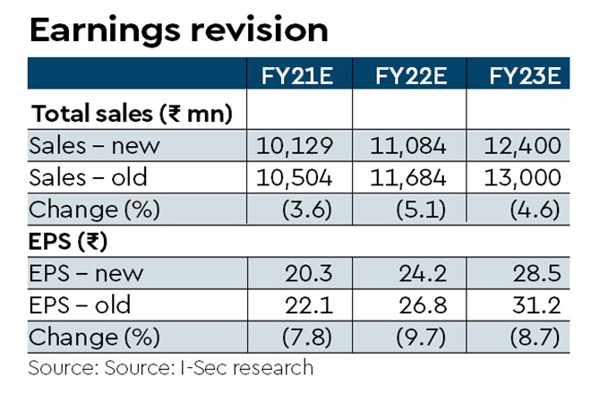 Impact on financials: Total formulations revenue for the company in FY20 was ~21% of total sales, which is being sold in the US and EU. We do not see any risk to the existing sales from this facility despite the warning letter as existing supplies would continue. However, new products may now get delayed until complete resolution. Additionally, the company’s expenditure towards remedial measures would negatively impact margins. We reduce revenue and earnings estimates by 3-5% and 7-10%, respectively, to factor in delay of new product approvals due to warning letter and margin pressure owing to related remediation costs.