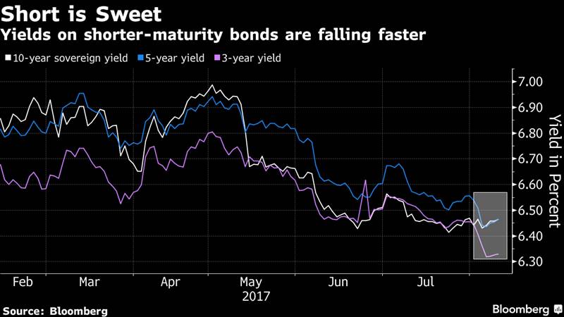 Demand for India’s shorter-maturity bonds is rising as traders bet the central bank is almost finished cutting interest rates. Sovereign securities due in less than a decade are being snapped up as the Reserve Bank of India is seen lowering benchmark borrowing costs just once more at best, according to a Bloomberg survey of 20 fixed-income money managers and dealers. Nomura Holdings Inc. prefers bonds maturing in three-to-seven years, while Standard Chartered Plc is recommending a long position in six-year notes. “We expect the mid-end — the belly of the curve — to do well relatively,” said Lakshmi Iyer, Mumbai-based chief investment officer for debt at Kotak Mahindra Asset Management Co. “This is a sweet spot, with lower rates and comfortable liquidity.” Shorter-duration bonds are outperforming since the RBI’s rate-deciding panel reduced its key repurchase rate to 6 percent last week, and maintained a neutral policy stance while saying it will watch incoming data. The five-year yield has dropped seven basis points since Aug. 1, the day before the central bank’s decision, to 6.47 percent, while the three-year rate has fallen 11 basis points to 6.34 percent. The 10-year yield is up three basis points in the period to 6.47 percent. The trend is likely to continue, traders say.