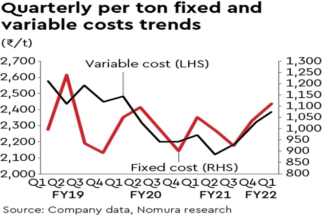Standalone Q1FY22 revenue of Rs 34 bn (-13% q-o-q, +46% y-o-y) came in line with our forecast but was 2% ahead of the Bloomberg consensus estimate, as the higher realisation was offset by lower volume. Ebitda of Rs 10.1 bn (-14% q-o-q, +45% y-o-y) was 2-3% below our forecast and the consensus estimate, driven by higher employee, energy and other expenses. PAT at Rs 6.6 bn (-14% q-o-q, +78% y-o-y) was 6%/11% above our/consensus estimates given lower depreciation (-22% q-o-q) and higher other income (+12% q-o-q).