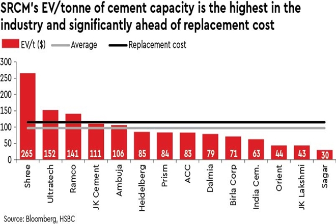 India’s cement sector has witnessed a sharp run-up QTD with the top 5 companies (HSBC coverage) up 25%. SRCM has slightly outperformed the sector (+28% QTD) and significantly outperformed the benchmark (Sensex up 19%). It currently trades at a record forward EV/Ebitda multiple of c24x and PE of c60x, making it the costliest cement stock globally. The rise is even more surprising considering the demand outlook has deteriorated, as the economy continues to grapple with COVID-19.