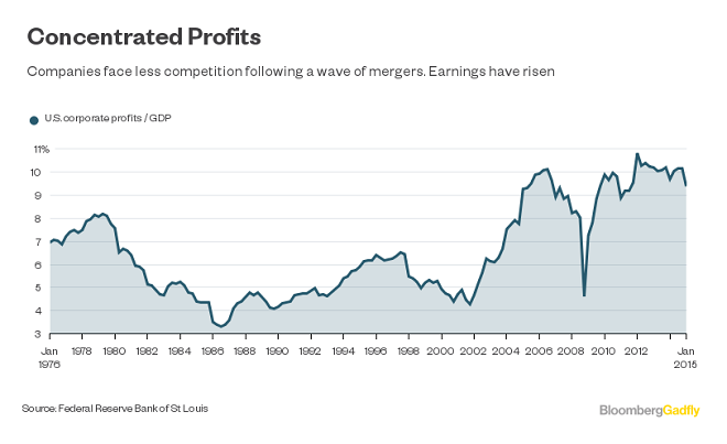 However, the stock market has also become a more profitable place for those that have survived the cull. Thanks to rampant consolidation and laissez-faire anti-trust enforcement industries are becoming increasingly oligopolistic. Less competition makes it easier for public companies to fatten margins, and higher profits certainly do affect valuations.