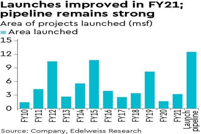 During Q1FY22, the company reported new sales of ~0.9msf with sales volume growing y-o-y across major cities such as Bengaluru, Pune, Gurugram, and Kochi; sales in Bengaluru recovered 37% y-o-y (down 26% q-o-q). Other cities that reported strong y-o-y growth include Pune (165% y-o-y), Gurugram (119% y-o-y) and Thrissur (95% y-o-y). There were no formal project launches during the quarter; the company has a robust launch pipeline of ~12.6msf projects over the next four–six quarters. It expects to launch projects in Bengaluru, Chennai and Gujarat soon.