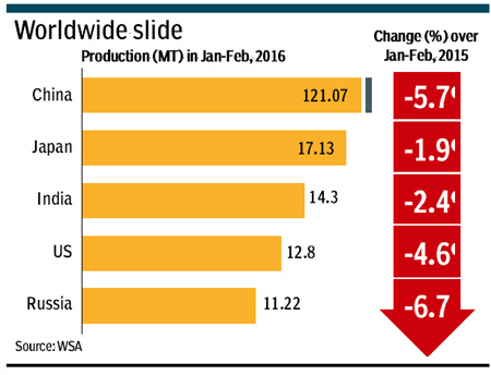 India’s steel production fell in the first two months of 2016, but at a rate much lower than the decline in global output, World Steel Association (WSA) data revealed.
