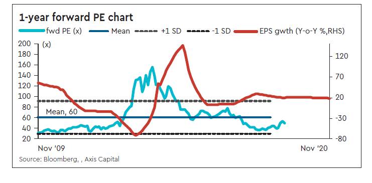 Ebitda margin remained flat. Gross margin declined ~230 bps q-o-q to 29.5%—inventory provisioning in portfolio of companies led to the losses. Company curtailed employee and overhead costs. Working capital position improved from 92 days to 70 days this quarter, thus, leading to Rs 49 bn cash; however, low dividend of Rs 7/share depresses the RoE.