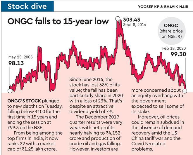 ONGC’s stock plunged to new depths on Tuesday, falling below Rs 100 for the first time in 15 years and ending the session at Rs 99.3 on the NSE. From being among the top firms in India, it now ranks 22 with a market cap of Rs 1.25 lakh crore. Since June 2014, the stock has lost 68% of its value; the fall has been particularly sharp in 2020 with a loss of 23%. That’s despite an attractive dividend yield of 7%.