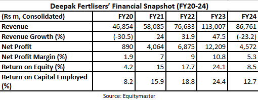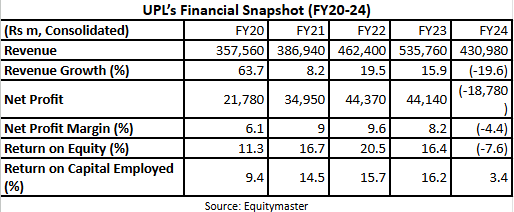 UPL’s revenue has grown at a 5-year CAGR of 14.6%. However, the company reported a loss in FY24. This robust growth has led to a strong RoCE and RoE averaging 26% and 23.7% over the last 5 years