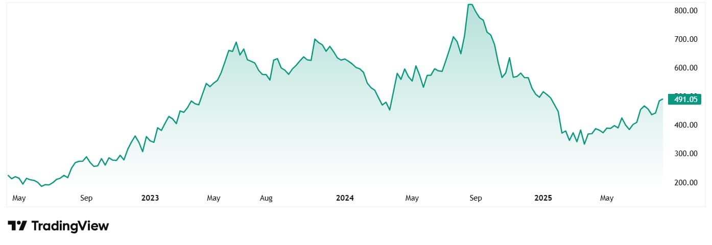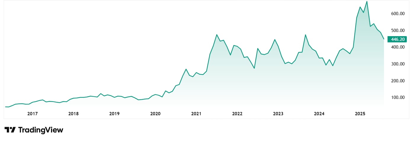 The share price of Bajaj Healthcare Ltd was around Rs 180 in August 2020, which has climbed to its current price of Rs 445 as on 22nd August 2025, which is a jump of about 150% in 5 years.