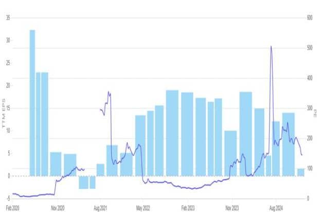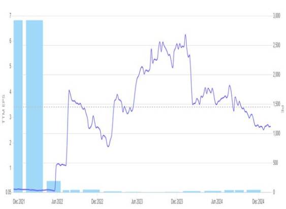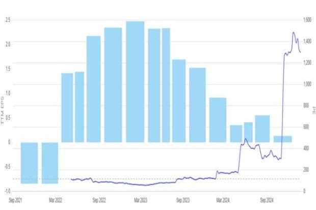 In early 2024, the P/E ratio soared above 500, indicating an overvaluation relative to earnings. This surge occurred despite only marginal improvement in EPS, possibly suggesting heightened market expectations for future growth rather than immediate performance. However, as EPS declined later, the P/E ratio began stabilising but remained elevated compared to historical levels.