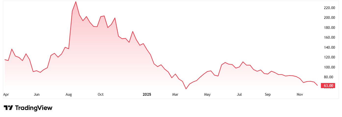 The share price of Naman In-Store when it was listed in April 2024 was around Rs 115, and has seen a steep decline as its current price as on 11th December 2025 is Rs 63. The stock is trading around its book value which is Rs 61.