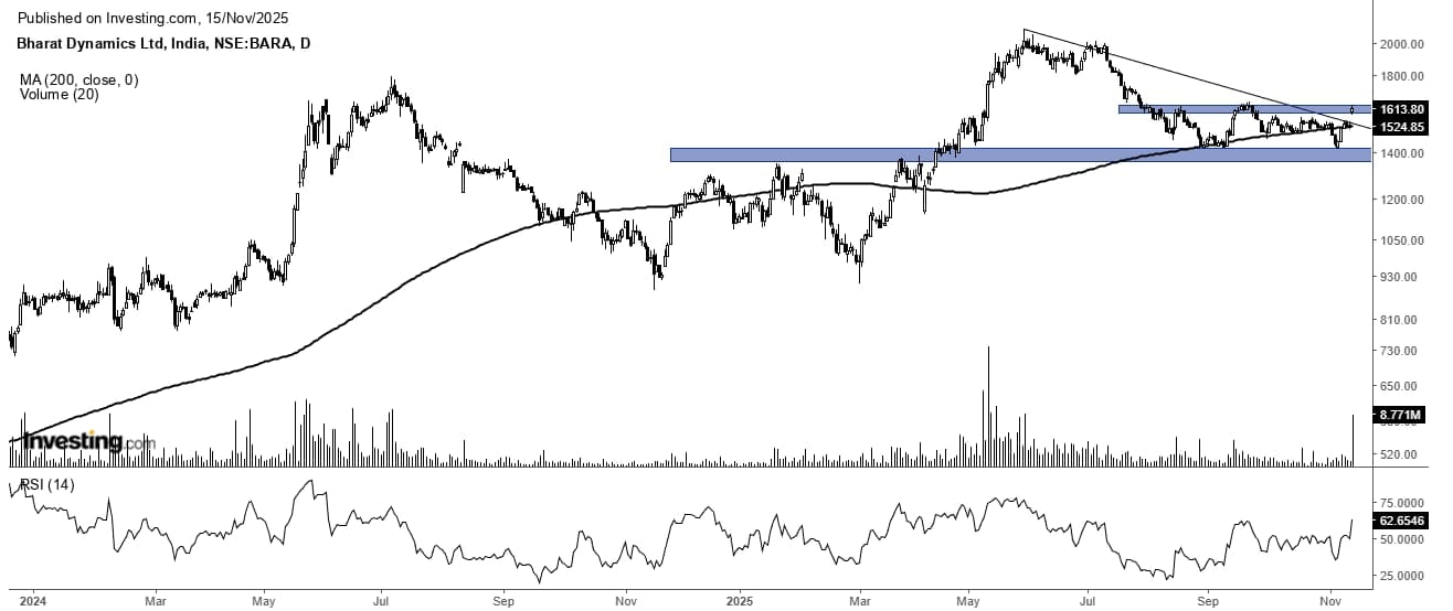 Bharat Dynamics has given a negative return and a decline of approximately 33% from May 2025 to November 2025. The stock was then ready for a significant pullback, as evidenced by daily signs of a fading trend.