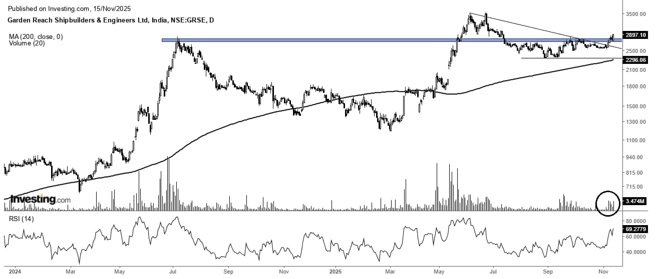 Garden Reach Shipbuilders (GRSE) witnessed a sharp 34% decline from its June 2025 peak of Rs. 3,560, reaching a low of Rs. 2,320. However, the current chart setup now suggests fresh buying interest and the possibility of a trend reversal.