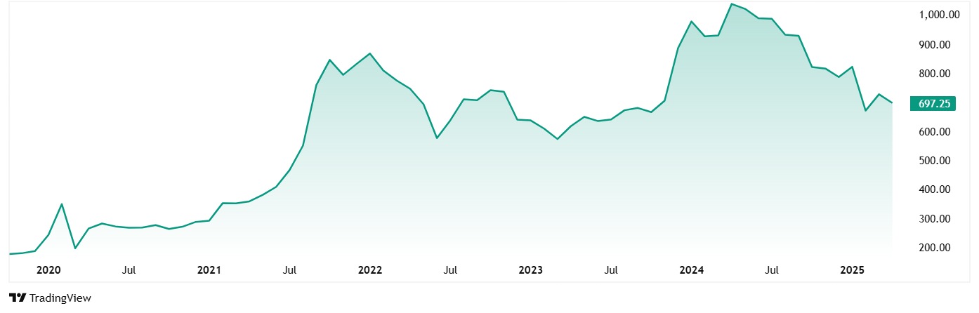 IRCTC’s share price was around Rs 250 in April 2020, which has grown to its current price of Rs 697 (as of closing on 7th April 2025). This represents a jump of 179%.