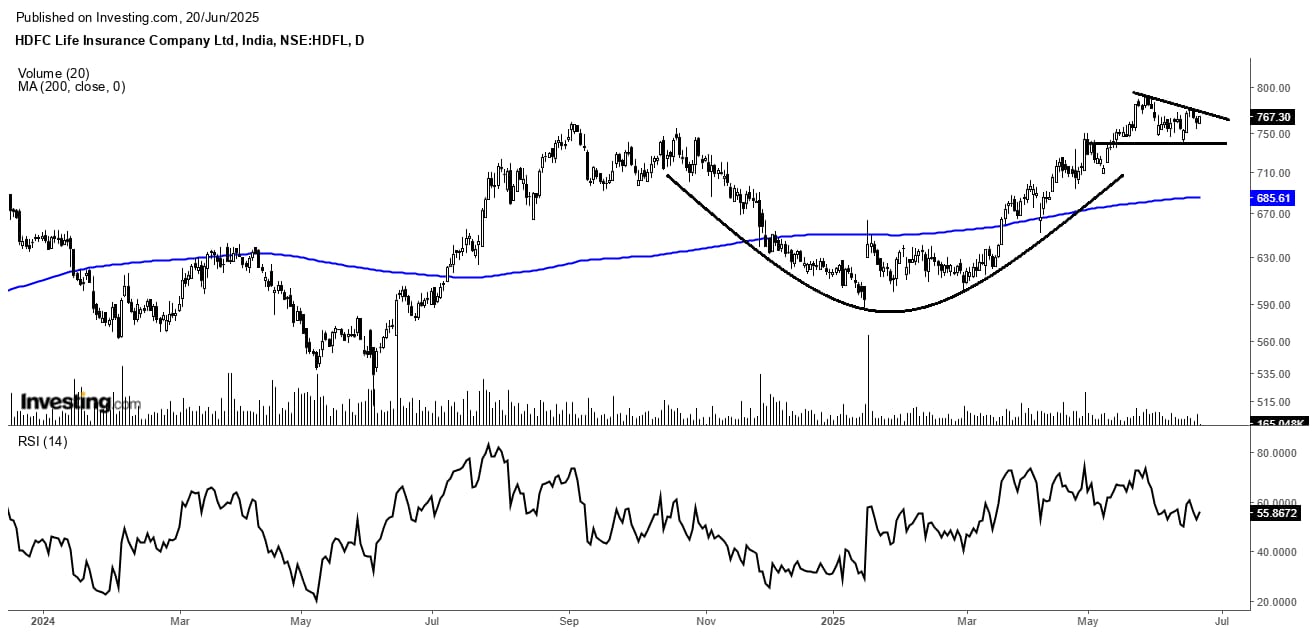 HDFC Life stock price started falling from ₹760 and made bottom near ₹580 in January 2025. Post that price started forming higher high, higher low pattern. From that January panic bottom, it has formed more than one bullish chart daily, such as rising channel, cup and handle, and as well many daily candles above the 200-day moving average. In addition, the 14-period RSI shows strength moving into the bullish zone suggesting HDFC Life can move.