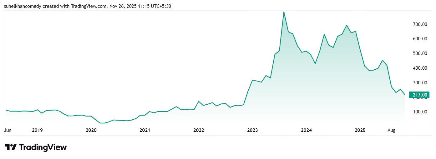 The share price of Affordable Robotic & Automation Ltd was about Rs 55 in November 2020, and as on 26th November 2025 it was Rs 218, which is a jump of almost 300% in just 5 years. Rs 1 lac invested in the stock 5 years ago, would have been close to Rs 4 lacs today.