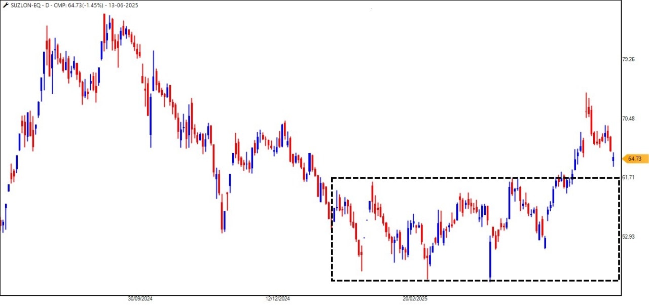 After hitting a 2024 high of Rs. 86.04, Suzlon saw a measured decline, eventually bottoming out at Rs. 46.15. While some may view this as a bearish trend, closer inspection reveals a classic re-accumulation phase, as per Wyckoff Theory.