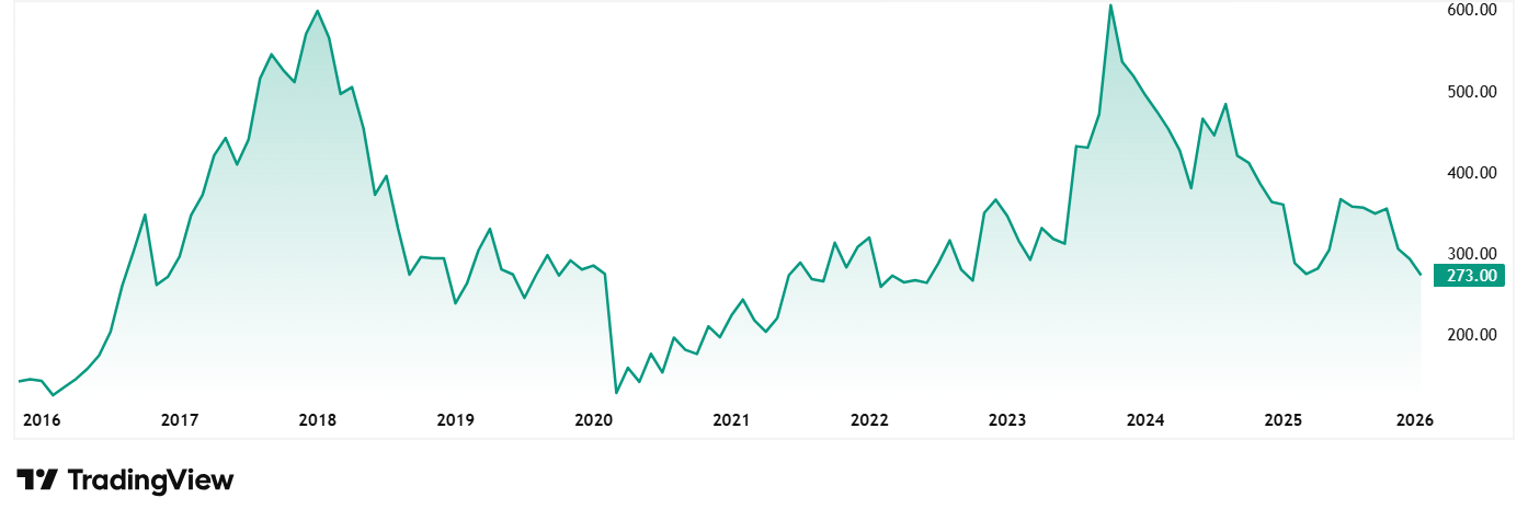 At the current price, the stock is trading at a discount of about 60% from its all-time high of Rs 700.