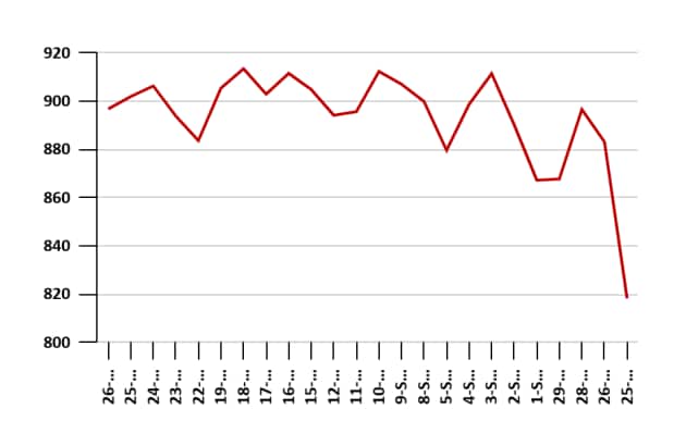Over the past few months the stock has faced significant selling pressure. The price has tumbled from a 52-week high of Rs 2,074 to Rs 898, a decline of nearly 56%.