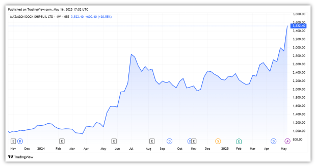 Mazagon’s revenue grew 30% from last year to ₹82.6 billion in 9MFY25, while margins nearly doubled to 23% (from 13% in 9MFY24). As a result, net profit surged almost 64% to ₹20.9 billion.