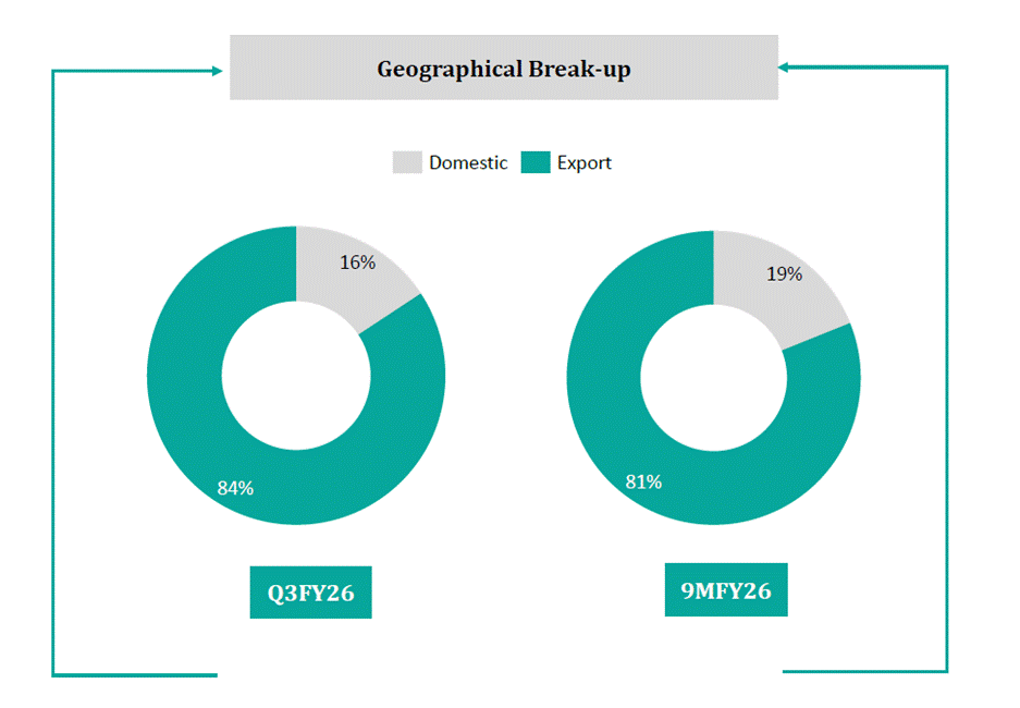 In 9MFY26, exports, including deemed exports, accounted for 12% of the company’s total revenue. Throughout this period, exports’ contribution to total revenue fluctuated quarterly. It started at 10.0% in Q1 FY26, peaked at 14.2% in Q2 FY26, and stood at 11.5% in Q3FY26.