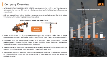 Action Construction Equipment (ACE) is a diversified construction Equipment Manufacturer. ACE operates across major economic sectors, including infrastructure, construction, Manufacturing, Logistics, and Agri sectors, leveraging over 30 years of industry presence. It is the world’s largest Pick & Carry Crane manufacturer and holds over 63% market share in Mobile and tower cranes.