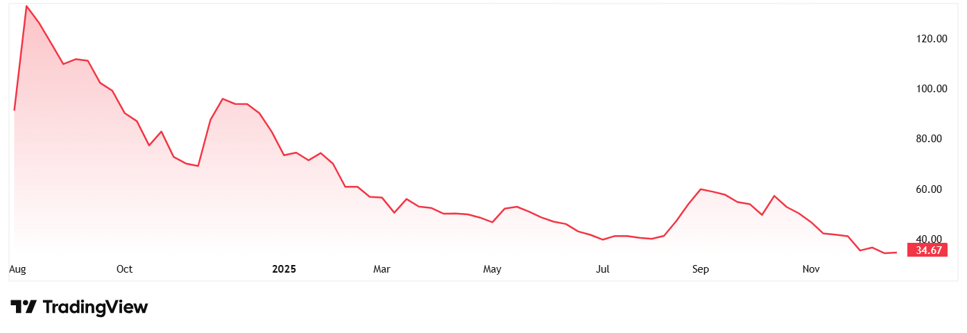 By the time the dust settled, the stock had crashed to a fresh all-time low of Rs 30.79, a huge 80% drop from its record peak of Rs 157 in August 2024.