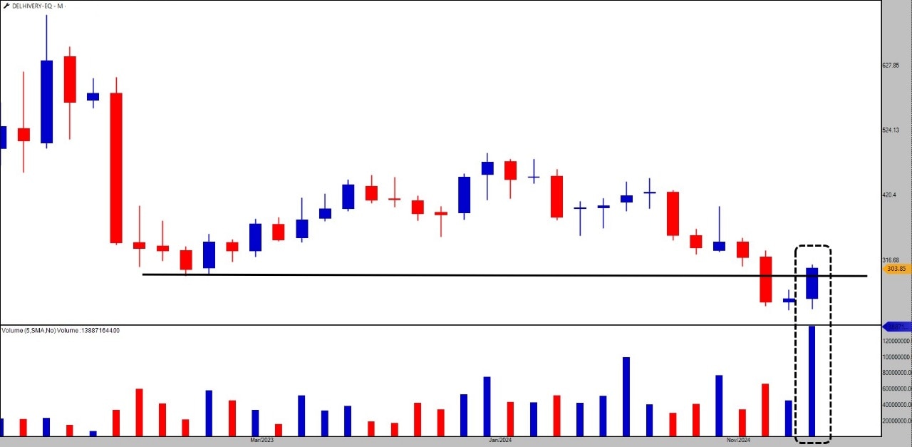Delhivery’s stock touched an all-time low of ₹236 in March 2025, forming a narrow range candle — a technical hint that selling pressure might be exhausting. When the market rebounded in April, Delhivery rode the wave with strength.