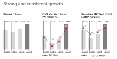 Consolidated revenue grew 60.5% over the past two years to ₹80.7 billion in FY25 from ₹50.3 billion in FY23. PAT increased over fivefold to ₹8 billion from just ₹1.3 billion in this period as operating margins more than doubled from mid-single digits of 6% to 16%. This performance was driven by tight cost discipline and market share gain backed by new launches.