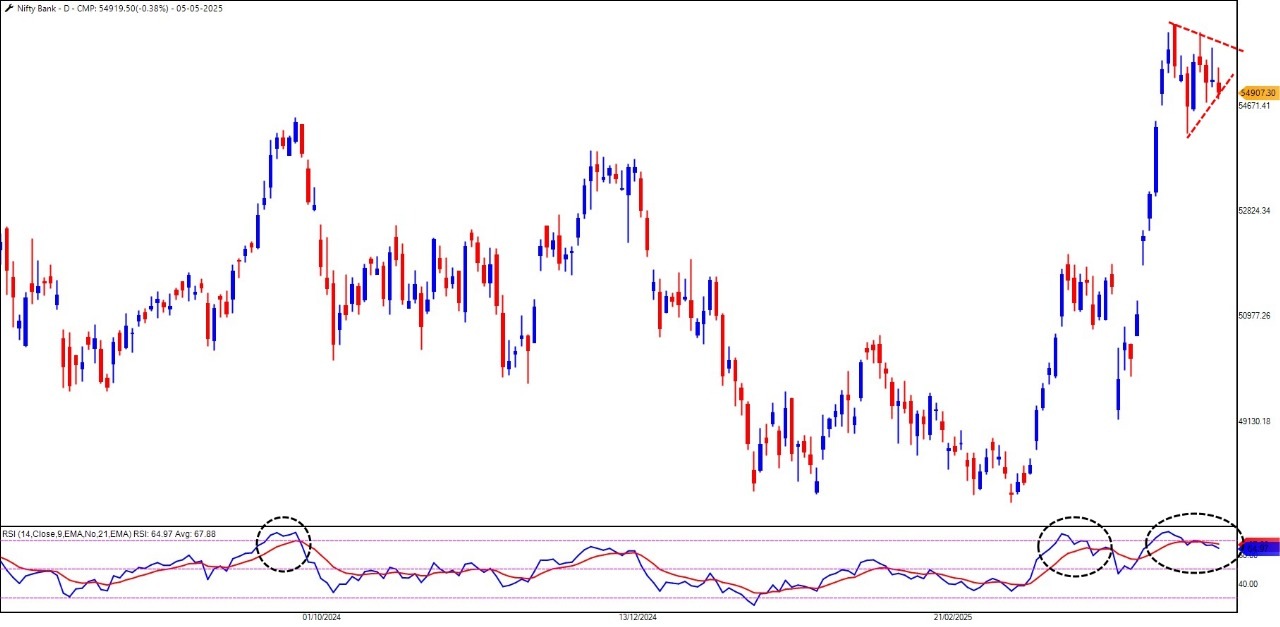 The Bank Nifty index has made waves in the market, hitting an all-time high of 56,098 in April, but it now hovers around the 55,000 mark. Meanwhile, the Nifty50 benchmark index is still around 7% away from its own record high, while banking stocks have continued to outpace the broader market. However, the recent retracements from 56,000 to 55,000 raise questions about the strength of this bullish momentum, particularly when analysed through the lens of technical indicators like the Relative Strength Index (RSI).