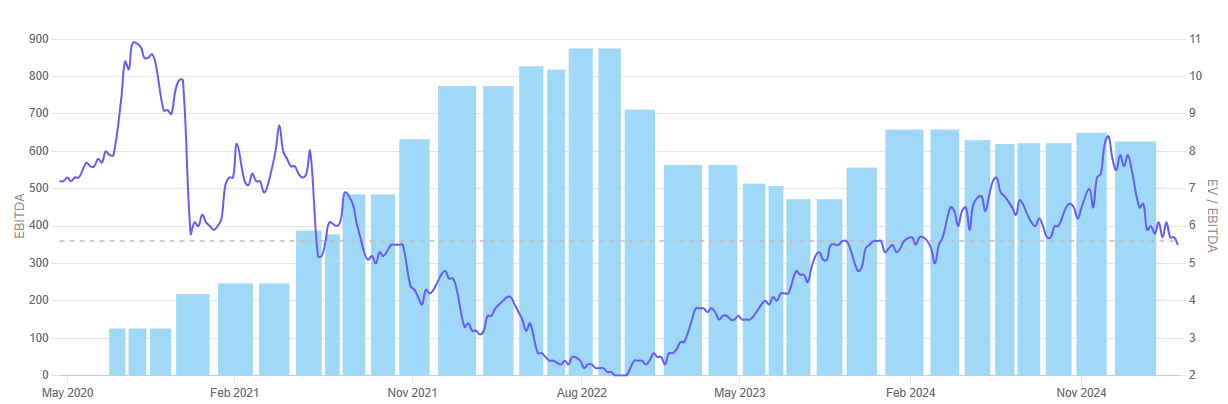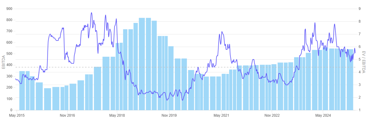 A closer examination of the chart shows Prakash Industries’ EBITDA having recovered gradually since 2020 after a long dip after 2018. The EV/EBITDA multiple has been oscillating, reaching a high of more than 7x in 2023 but stabilizing since then at 5.5x.
